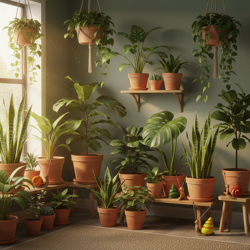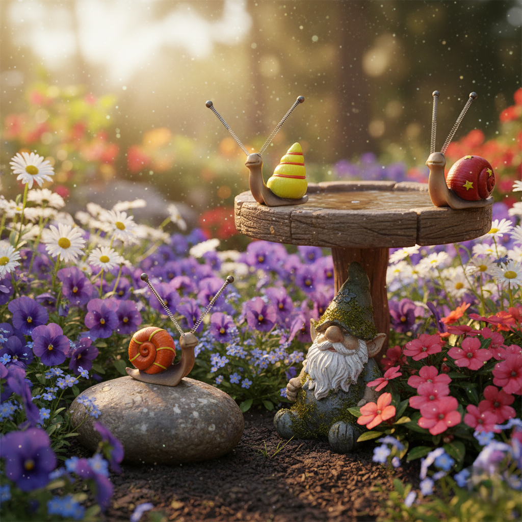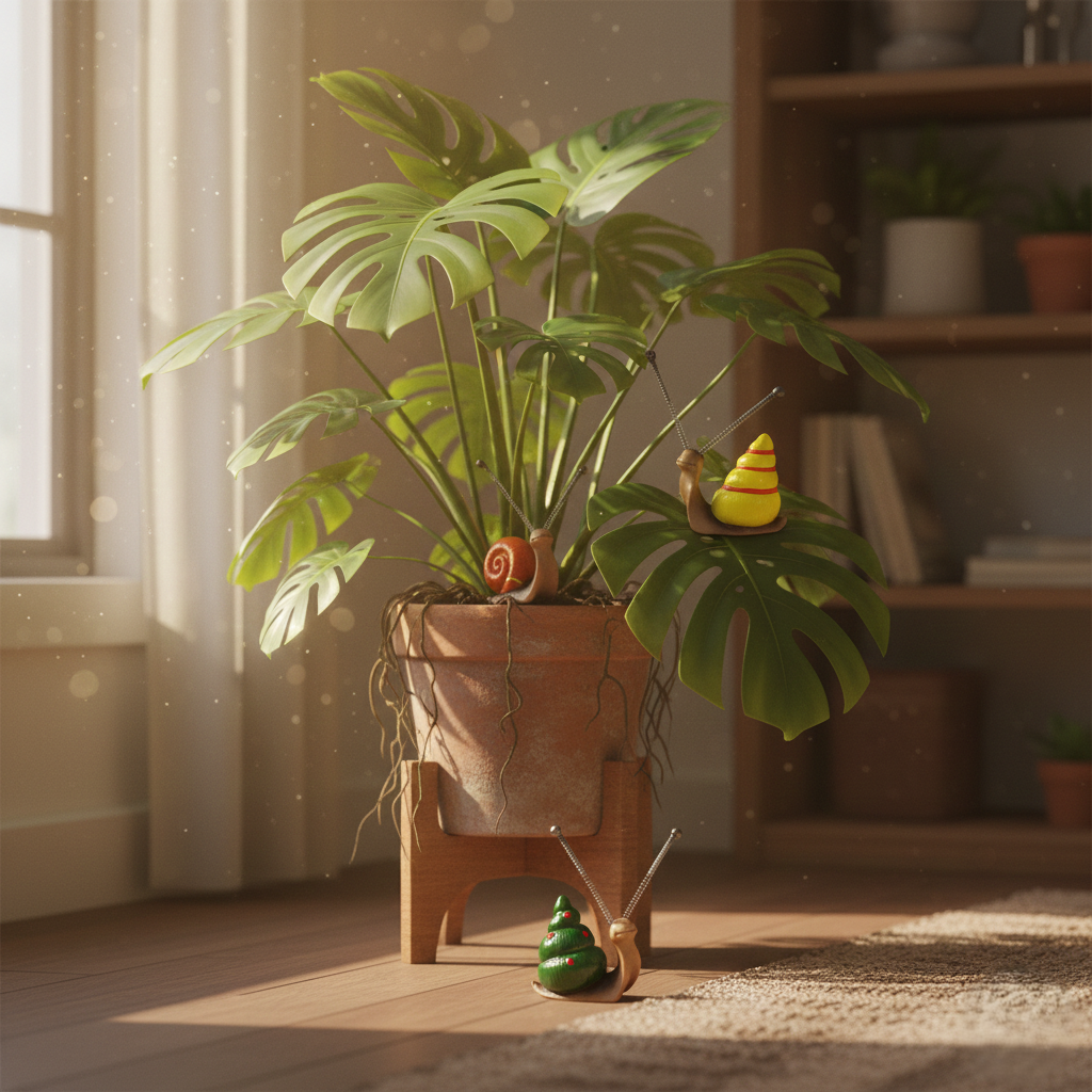 🐌 Decorative Variation That Exudes Life: Good way to vary texture, colour, shape among the foliage, pot, soil etc. A snail’s shell, shine, and shape contrast nicely with bark and leaves.